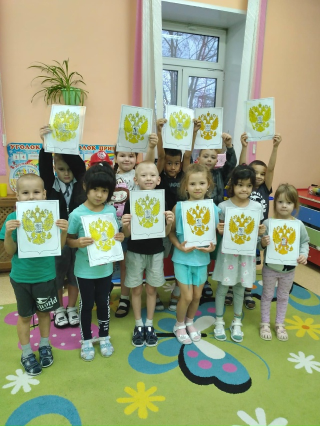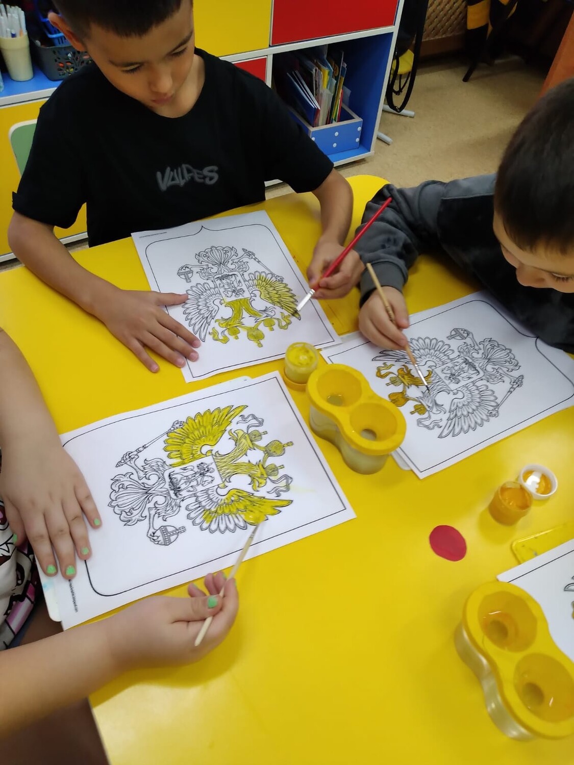 Воспитатель, Ирина Николаевна, с детьми повторили государственные символы: герб, флаг и гимн, назвали столицу нашей Родины. Выяснили, что герб России символизирует красоту и справедливость, победу добра над злом. Рассмотрели внимательно элементы герба. Повторили правила использования гуашевых красок на рисовании. В конце занятия получилась красивая выставка.