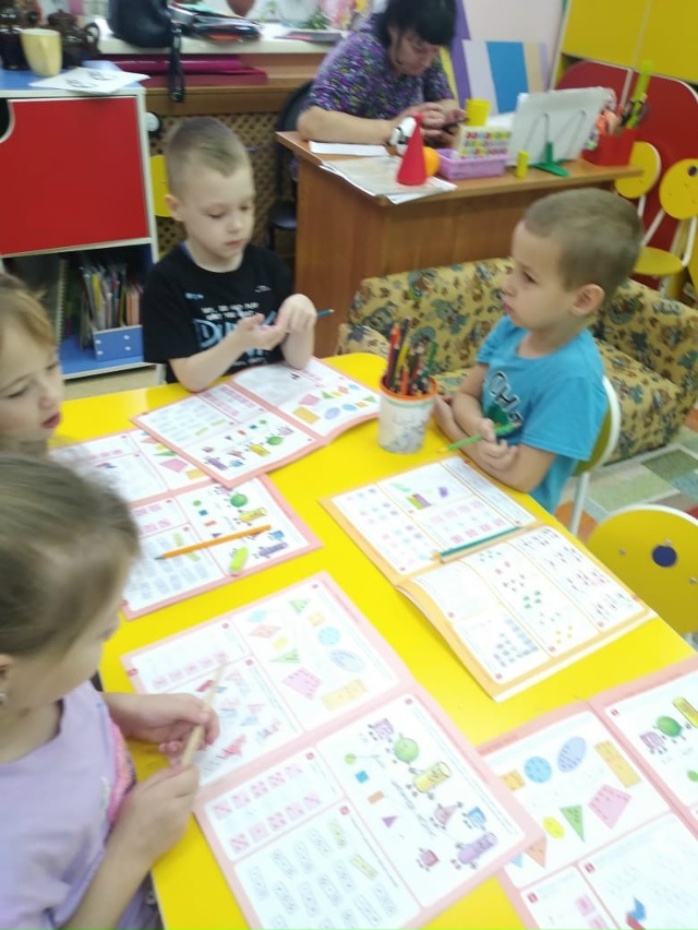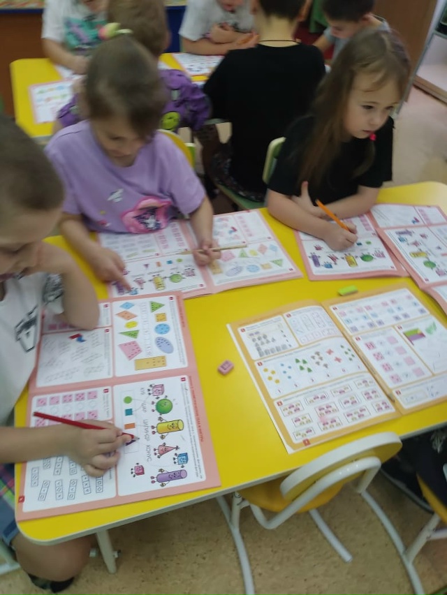 Воспитатель, Ирина Николаевна, с детьми повторили геометрические тела и геометрические фигуры. Дети с интересом выполняли задания в рабочих тетрадях на сходство, соедини по точкам, расставь знаки: <,>,=. Выполнили физминутку «Геометрические фигуры».
